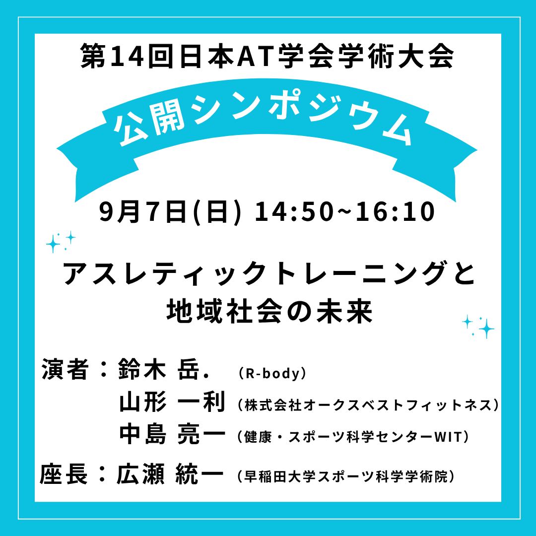 2025年9月6日(土)~7日(日)に帝京平成大学池袋キャンパスにて開催される、第14回日本アスレティックトレーニング学会学術大会にて弊社代表の山形が公開シンポジウムに登壇致します。(株)オークスベストフィットネスが地域社会にどのように貢献できるチャレンジをしているのか、合わせて地域における部活動地域展開などの活動内容をご紹介させていただくとともに、「アスレティックトレーニングが地域社会の未来にいかに貢献できるか」についてお話しをする予定となっております。