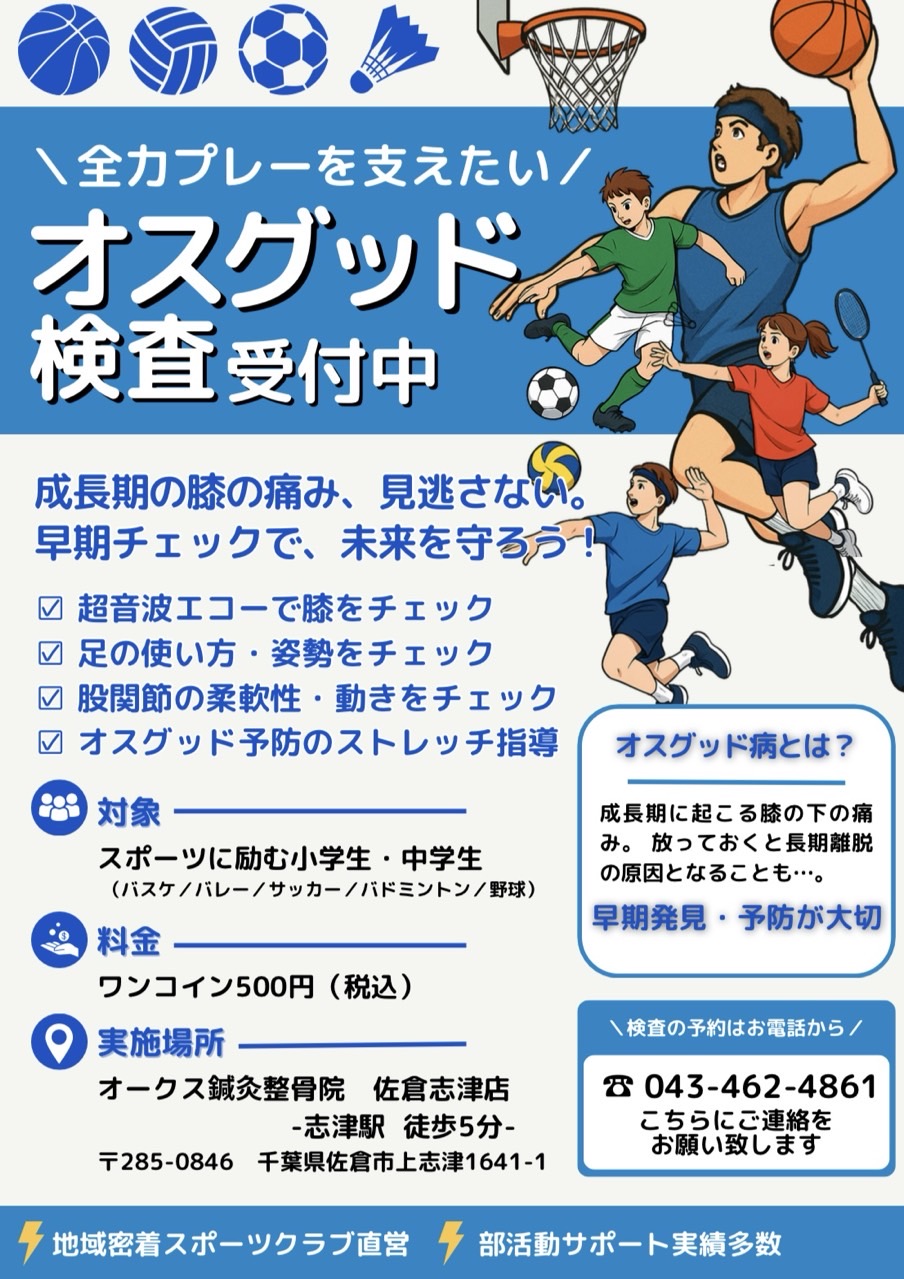 このたび、オークス鍼灸整骨院 佐倉志津店にて、スポーツに全力で取り組む小・中学生の皆さんを応援するため、このたび当院の歴代スタッフを特別に招集し、**『オスグッド検診』**を一日限定で開催いたします!