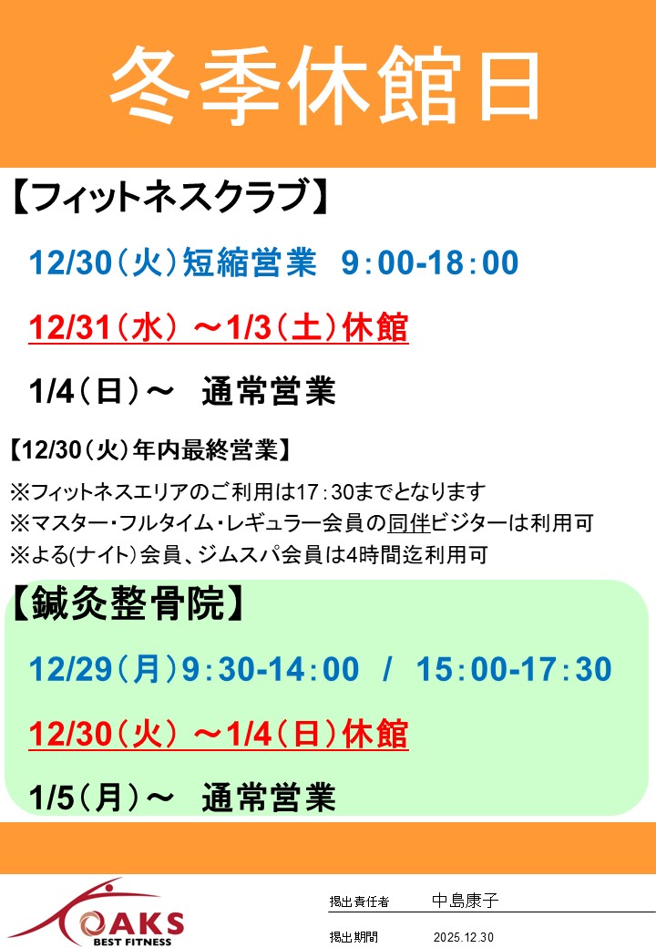 冬季休館日【フィットネスクラブ/鍼灸整骨院】